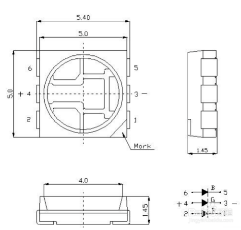 1、5050RGB貼片LED燈珠是5mm*5mm*1.6mm,光強高(純白光,暖光的稍微小一點)。它的工作電壓和普通的LED一樣,只需要3.0-3.4V,電流也是一樣60MA。